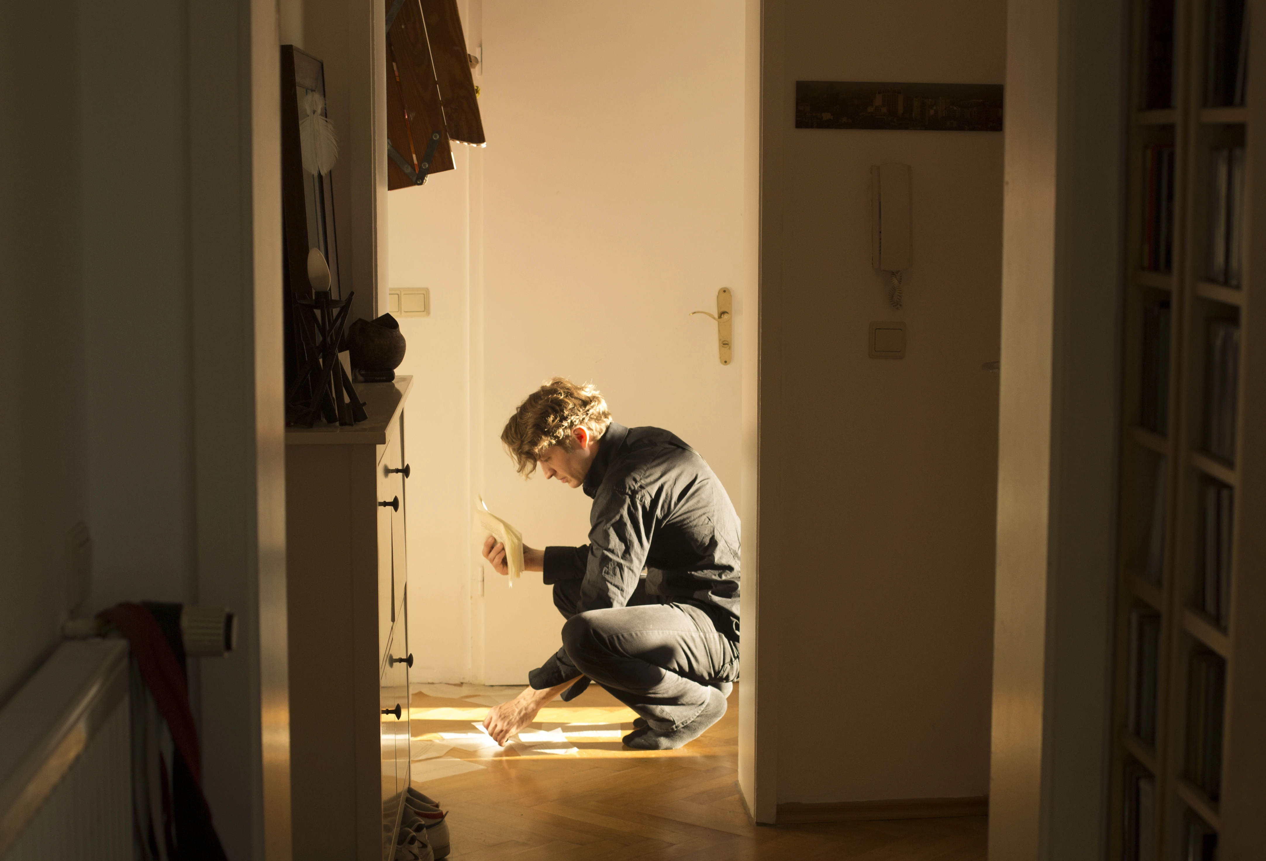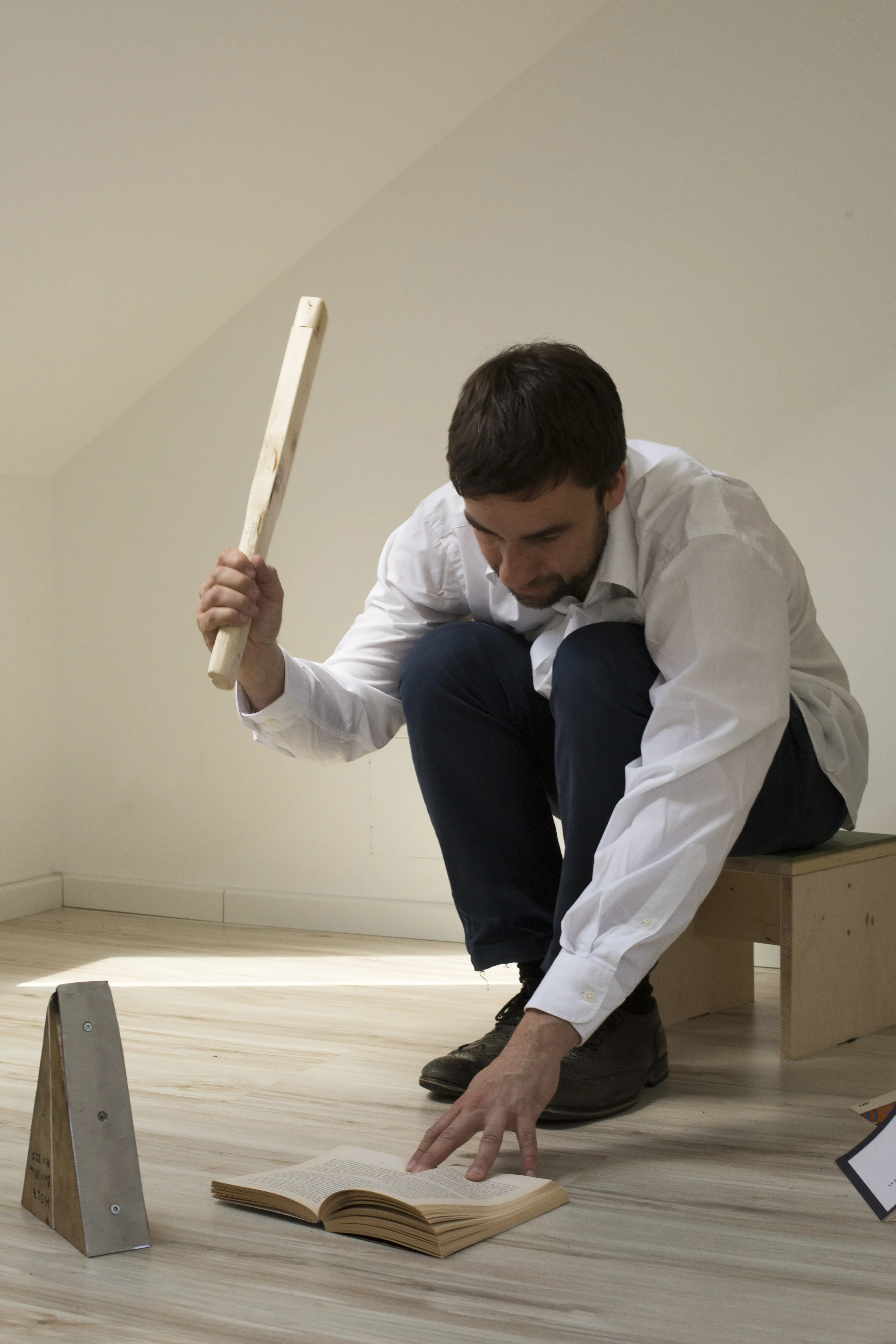 Diese Filiale nutzte zwei unverbundene und nur per Treppen zugänglichen Räume über einer Privatwohnung in Friedrichshain. Zimmermann führte die Wartenden einzeln in einen der Räume und nahm drei Bücher aus der Ablage. Die Seiten voran stürzte er jedes Buch auf einen spitzen Klotz, der es an zufälliger Stelle öffnete. Auf diese Doppelseite schlug er mit einem Nagelknüppel ein und markierte so einen Satz. Schließlich las er nacheinander drei ausgewählte Sätze aus den drei Büchern vor und verabschiedete die Besucher:innen. Die Tippgeräusche aus dem zweiten Dachgeschossraum rührten von einem Verfahren her, mit dem Born Texte produzierte: Er tippte Sätze aus Büchern ab, die er und Zimmermann während früherer Lektüren unterstrichen haben. Das Geräusch der Blätter, die er in die darunterliegende Wohnung warf, wechselte mit dem Tippen der Schreibmaschine ab.